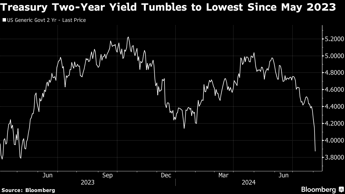 (Bloomberg) -- The selloff in stocks intensified and bond yields tumbled as a weak jobs report fueled worries that the Federal Reserve’s decision to hold rates at a two-decade high is risking a deeper economic slowdown.