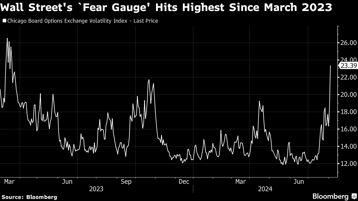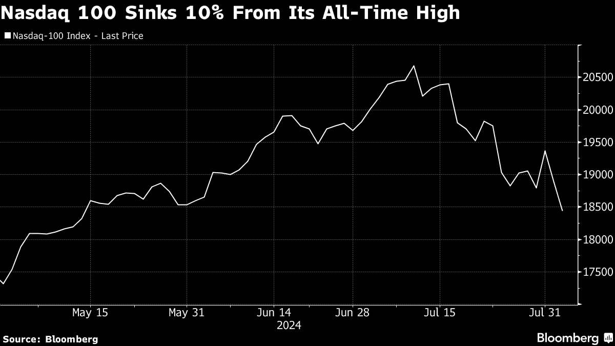 Those fears roiled trading around the globe, spurring a massive surge in volatility and a flight away from the riskier corners of the market. The S&P 500 saw its worst reaction to jobs data in almost two years. A plunge in key technology companies sent the Nasdaq 100 down over 10% from its peak, passing the threshold that meets the definition of a correction. A rally in Treasuries extended into a seventh straight day, with traders projecting the Fed will cut rates by more than a full percentage point in 2024.
