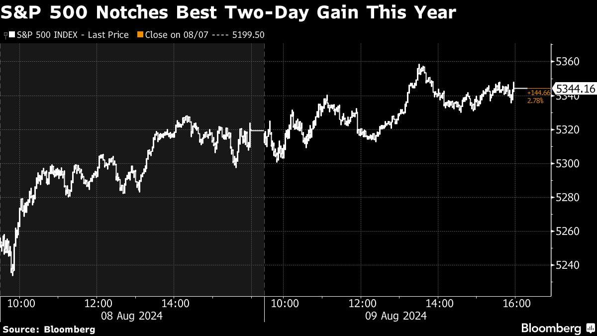 (Bloomberg) -- A rebound in stocks in the final stretch of a wild week drove the market to its biggest back-to-back advance in 2024.