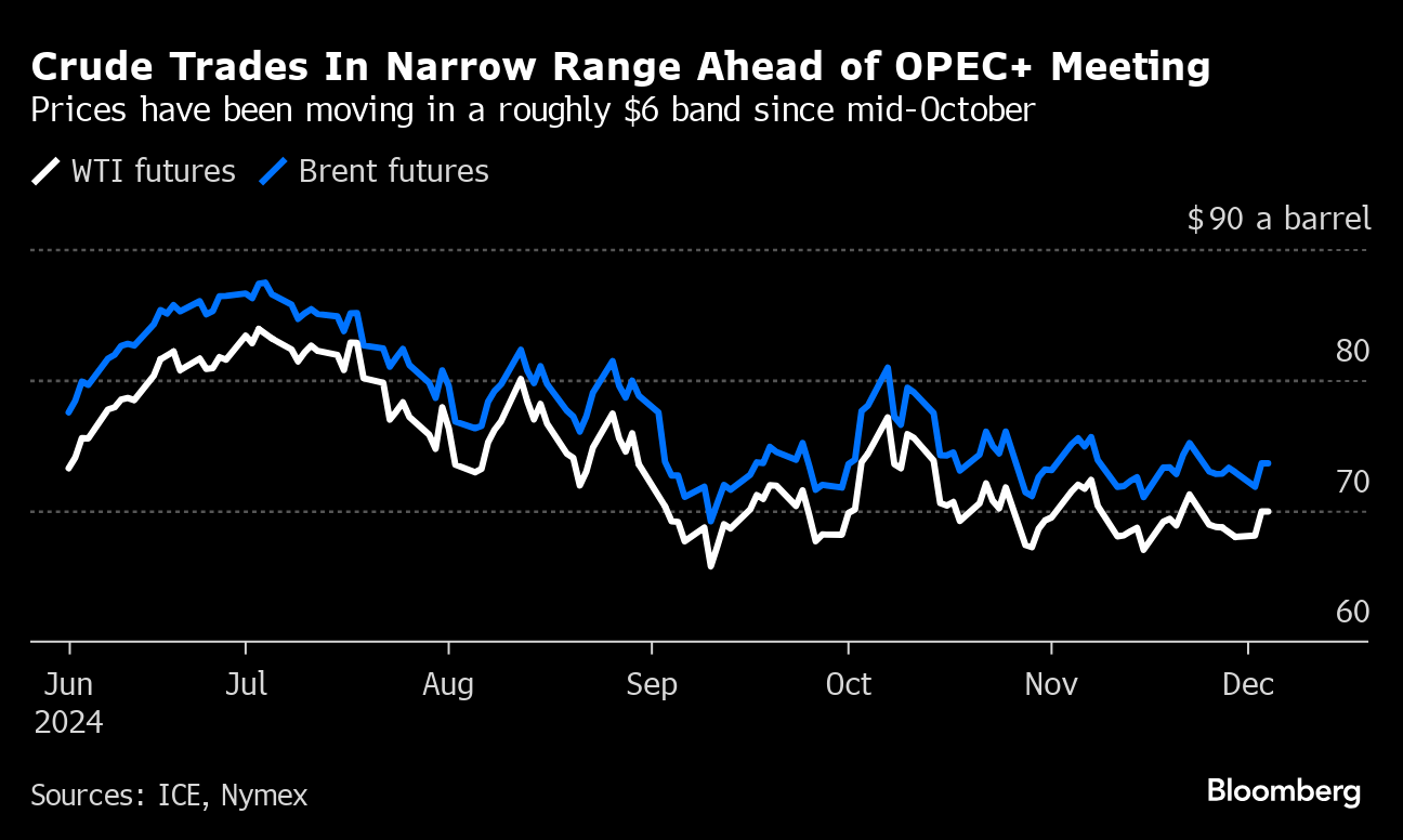 Crude remains caught in a tight range, trading within a roughly $6 band since the middle of October, buffeted by competing drivers including the imminent Donald Trump presidency, geopolitical tensions in the Middle East and Ukraine, and a lackluster demand outlook from top importer China. With widespread concern the global market faces a glut next year, OPEC+ members will meet on Thursday to review supply policy for 2025.