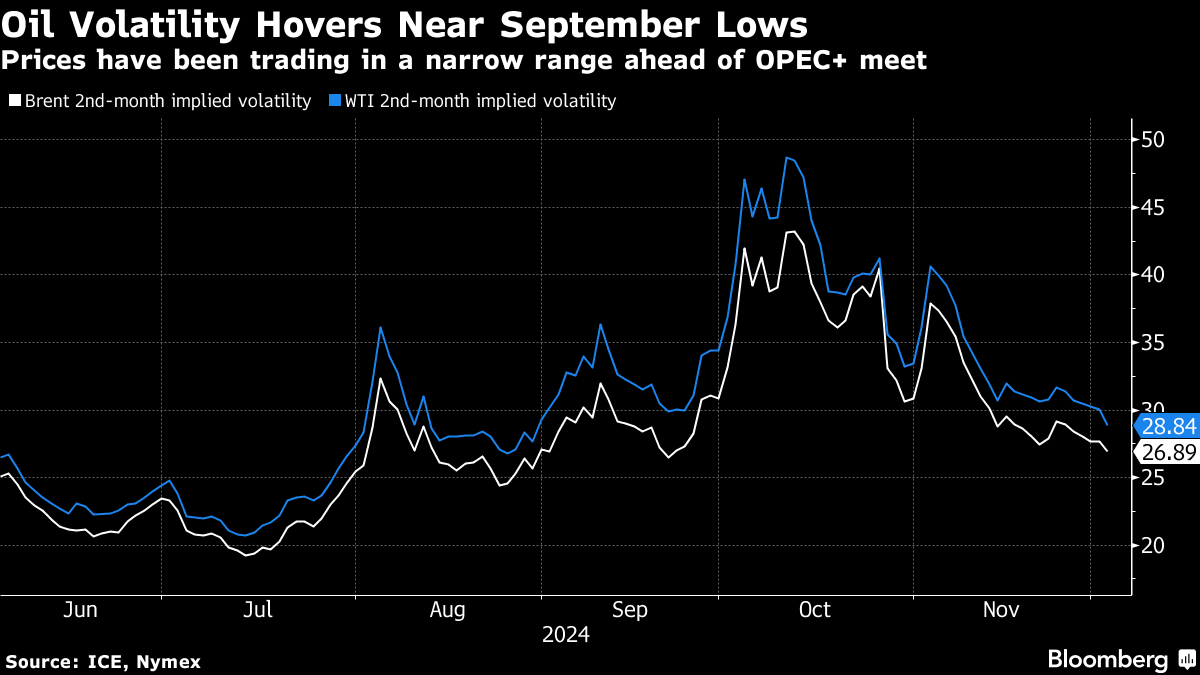 Still, gauges of implied volatility for oil have sunk to the lowest in about two months as futures remain stuck in a range of about $6 since mid-October.