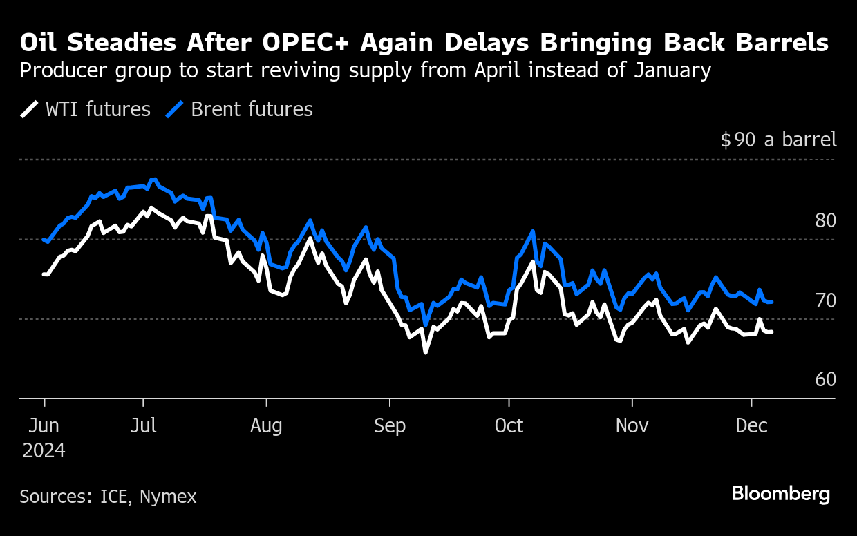 (Bloomberg) -- Oil steadied after OPEC+’s decision to push back the revival of shuttered production by another three months failed to lift sentiment in a market that’s expected to suffer from a glut next year.