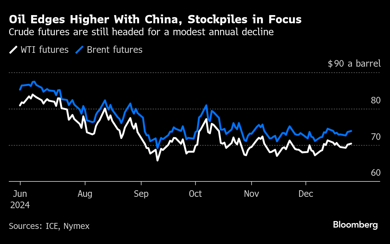 Crude is headed for a modest annual drop, although prices have been confined to a narrow range since mid-October. Heading into 2025, traders are looking at the possible implications of Donald Trump’s upcoming presidency, Beijing’s efforts to support its economy, and prospects for global crude supplies, with OPEC+ planning to loosen curbs only gradually after a series of delays.