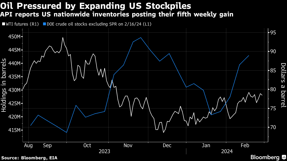 Official data on US inventories come later Wednesday. If these confirm an expansion, that would be a fifth week of gains in the largest oil consumer.