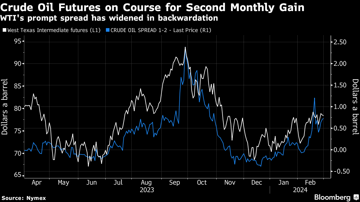 Global benchmark Brent was little changed below $84 a barrel, up more than 2% in February following a bigger gain the month before. West Texas Intermediate was above $78. Crude timespreads have widened further into backwardation, a bullish pattern marked by near-term prices above longer-dated ones.