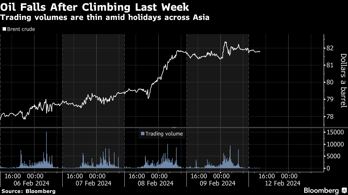 (Bloomberg) -- Oil declined following last week’s advance after Iran’s foreign minister flagged the Israel-Hamas conflict could be moving closer to a diplomatic solution. Trading remained muted with many Asia markets closed for Lunar New Year holidays.