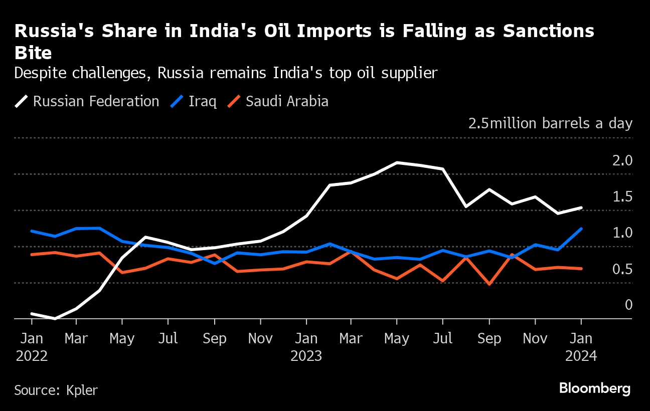 Oil imports from Russia, negligible before Moscow’s invasion of Ukraine, climbed steadily through 2022 and the first half of last year as India saw an opportunity to procure discounted barrels. Russia overtook traditional suppliers like Iraq and Saudi Arabia.
