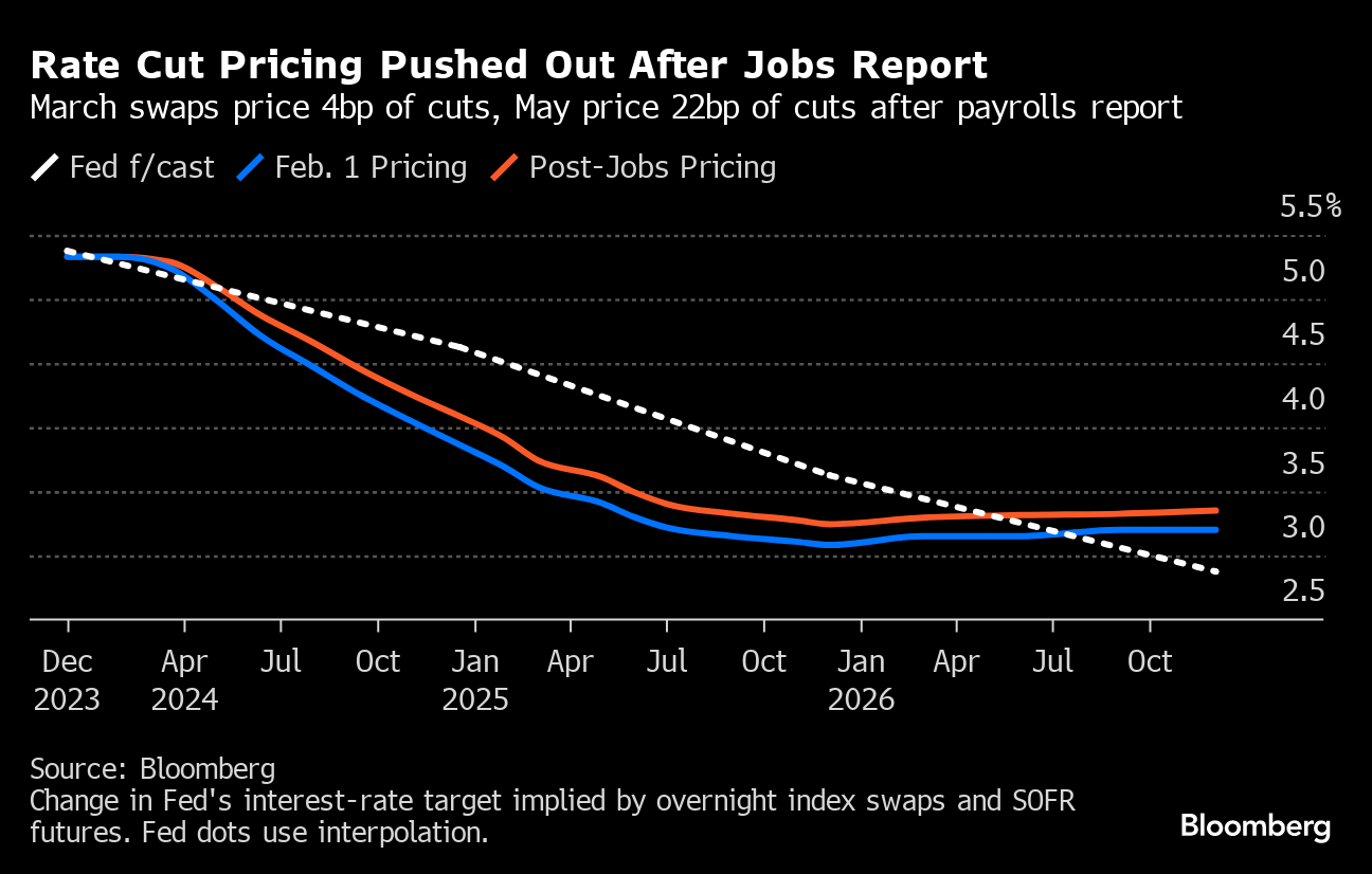 “Today’s report reinforces the narrative this week that the Fed does not need to rush into rate cuts,” said Jason Pride at Glenmede. “A March rate cut now appears increasingly unlikely. The more likely trajectory is two-three cuts this year beginning around summer.”