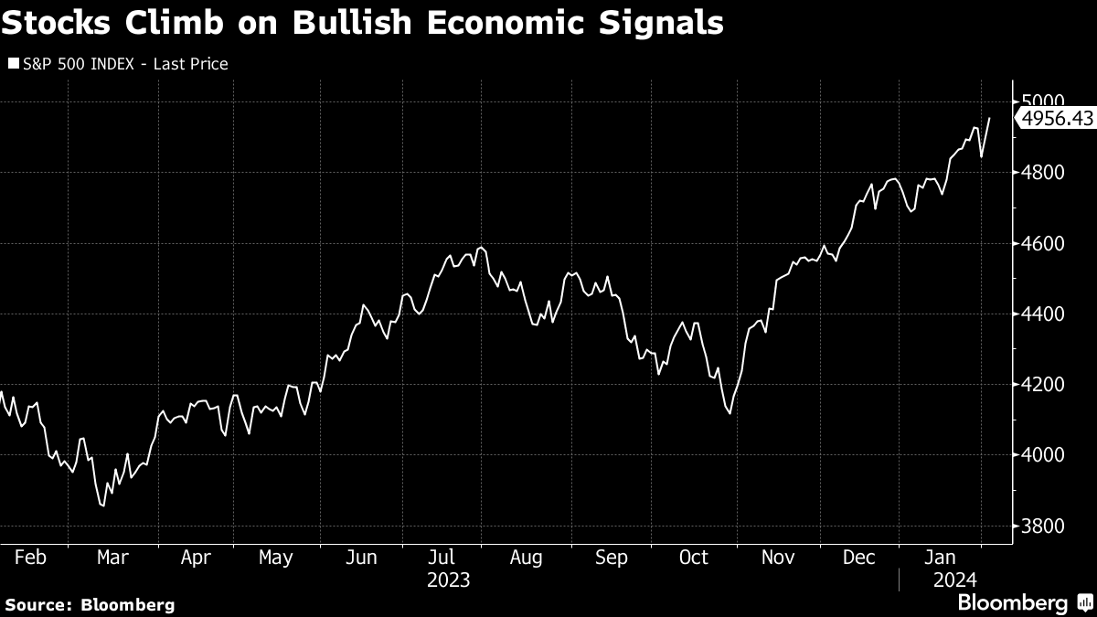 Equities hit all-time highs, with the S&P 500 near 4,950 and the Nasdaq 100 up 1.5% after bullish outlooks from Meta Platforms Inc. and Amazon.com Inc. Economic optimism outweighed bets the Federal Reserve will refrain from cutting rates in the first quarter. Treasury two-year yields jumped 19 basis points to 4.39%. The dollar rose toward levels last seen before the Fed’s December “pivot.”