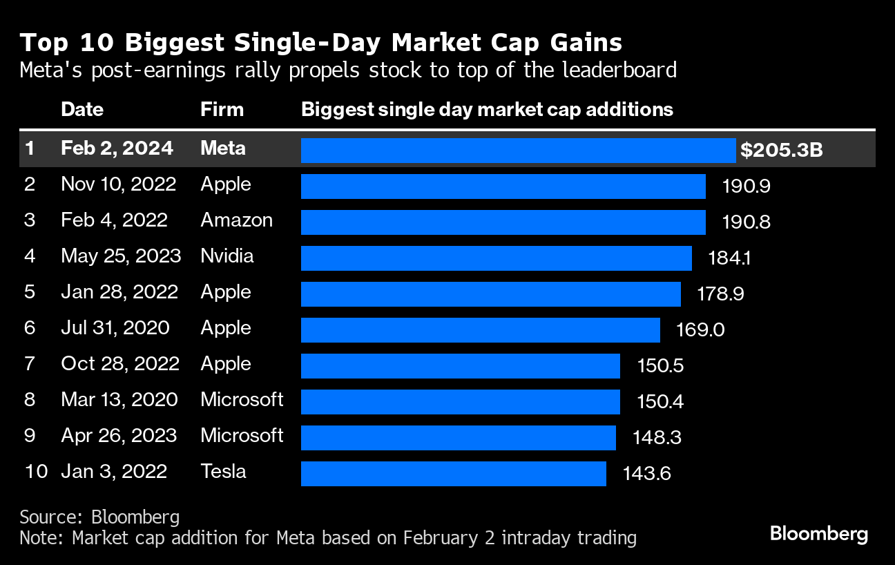 Equities powered ahead Friday, led by a rally in the S&P 500’s most-influential group: technology. Meta, which dazzled shareholders with yet another impressive quarterly earnings report soared and was poised to add roughly $200 billion to its market capitalization. This would be the biggest single-session market value addition, eclipsing the $190 billion gains made by Apple Inc. and Amazon.com Inc. in 2022.