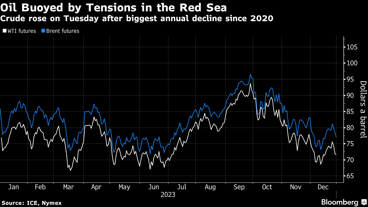 “Ongoing geopolitical tensions are anticipated to provide support to prices,” said Priyanka Sachdeva, senior market analyst at brokerage Phillip Nova Pte in Singapore, referring to the Red Sea. A “recovery in China is also a matter of concern for oil traders going into 2024.”