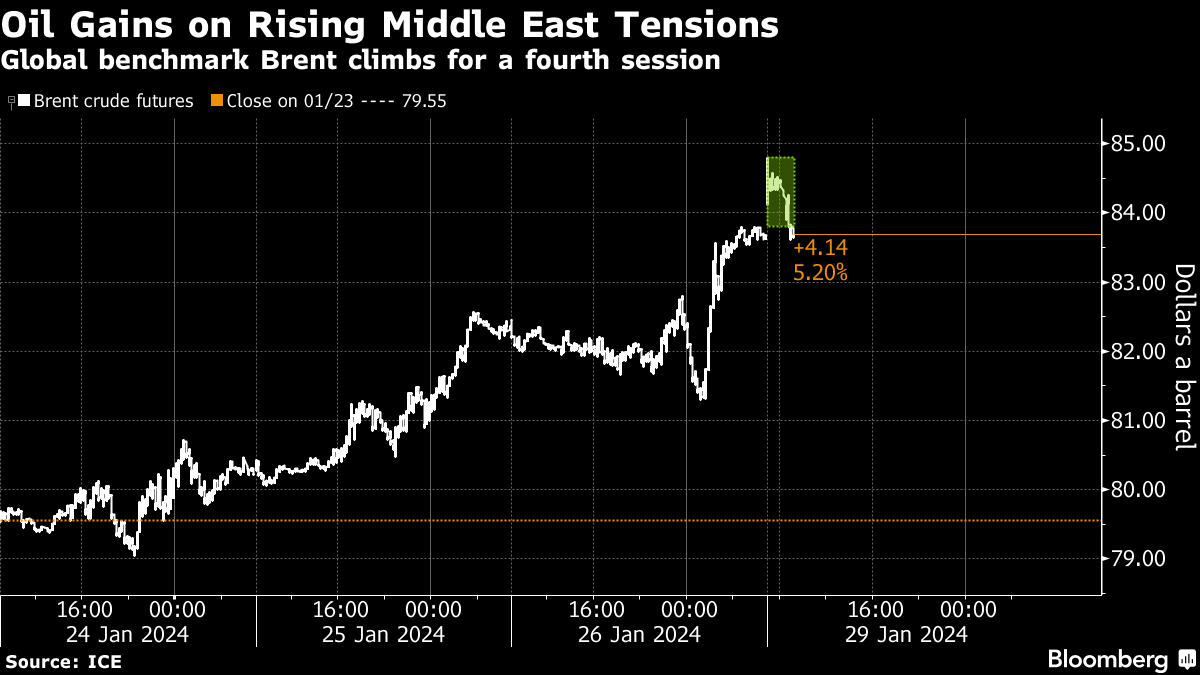 (Bloomberg) -- Oil rose after separate attacks in the Middle East that killed US troops in Jordan and hit a fuel tanker in the Red Sea, an escalation of tension in the region that accounts for around a third of the world’s crude output.