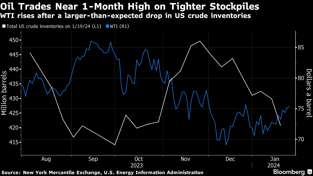 West Texas Intermediate climbed above $75 a barrel after hitting the highest since Dec. 26 in intraday trade on Wednesday, while Brent topped $80. US inventories fell by more than 9 million barrels last week, six times more than forecast, to hit the lowest level since October.