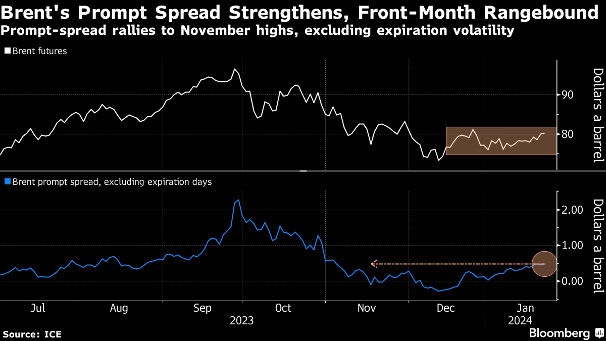 Still, a critical oil-market barometer for supply and demand known as the prompt-spread has been bolstered by the increased risks in the Red Sea. Global benchmark Brent crude’s front-month futures are trading at a 44-cent premium to the next contract, near the highest since November, excluding expiration days.