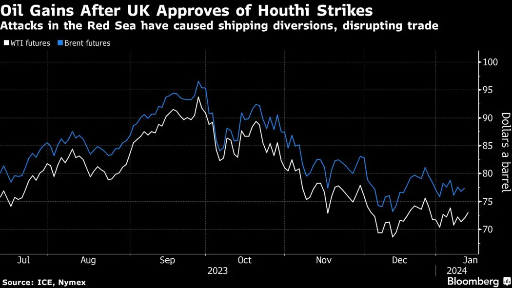 (Bloomberg) -- Oil rose after the US and its allies launched airstrikes against Houthi rebels in Yemen, retaliating for attacks on ships in the Red Sea that have imperiled flows of fuel and goods through the vital waterway.