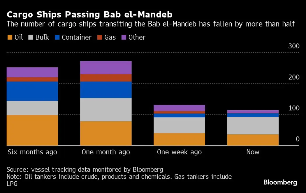 Numerous vessels turned away following the advice. The number passing through the Bab el-Mandeb since Friday has fallen by more than half compared with the corresponding period a month earlier, ship-tracking data monitored by Bloomberg show.
