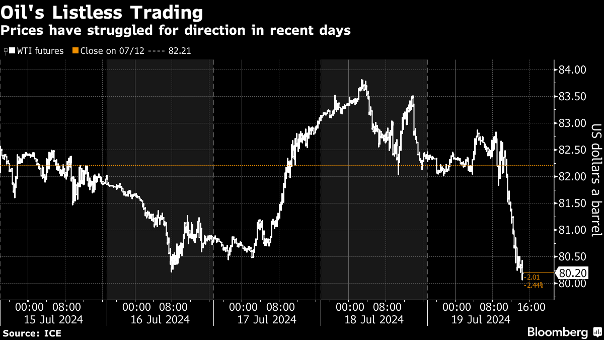 West Texas Intermediate fell to near $80 a barrel, posting the biggest one-day loss since early June. Futures capped a second straight weekly decline. Volatility has remained near multi-year lows, while volumes were lower than the 10-day average, according to data compiled by Bloomberg. Bearish sentiment across the broader commodity markets also weighed on oil.