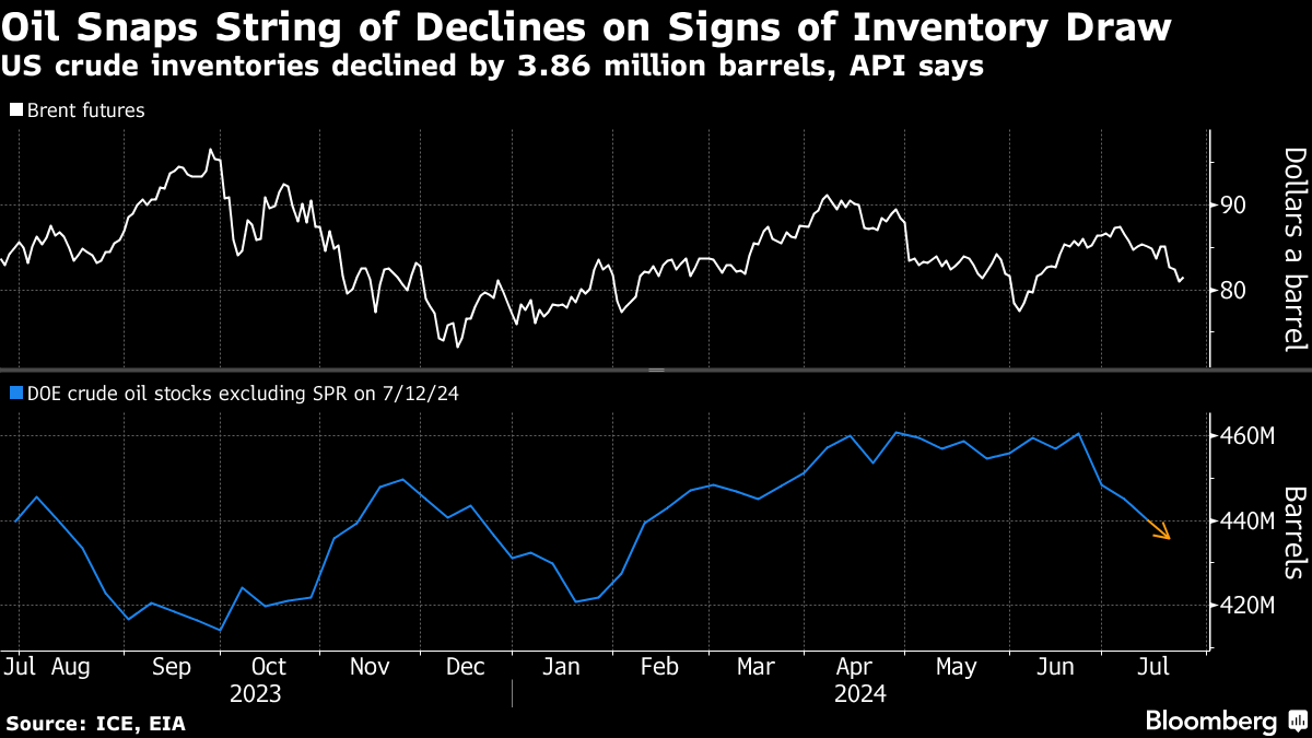 Brent rose above $81 a barrel after shedding almost 5% over the previous three sessions, with West Texas Intermediate near $77. The industry-funded American Petroleum Institute reported stockpiles shrank by 3.86 million barrels, with a drop also seen at the Cushing, Oklahoma, hub.