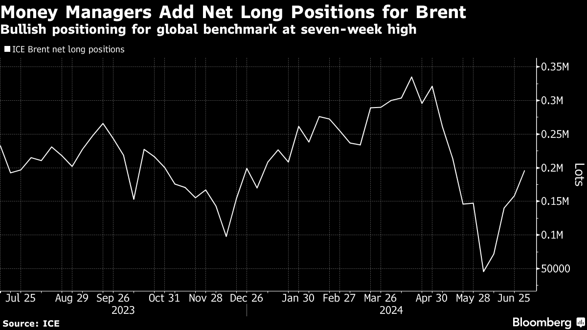 Oil touched the highest level since late-April last week as expectations for higher demand and lower stockpiles over the summer months pushed prices higher. While the rally has faced some resistance from signs of weakness in China, the largest crude importer, wider market expectations for US interest-rate cuts have helped to buoy risk assets, including commodities. Money managers increased their net-long positions on Brent for a fourth week.