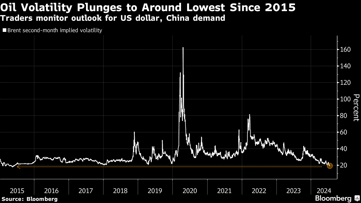 Oil’s listless trading has sent volatility to a multiyear lows, with Brent’s implied volatility — a forecast of the likely movement of crude that’s tied to options pricing — near the lowest since 2015.