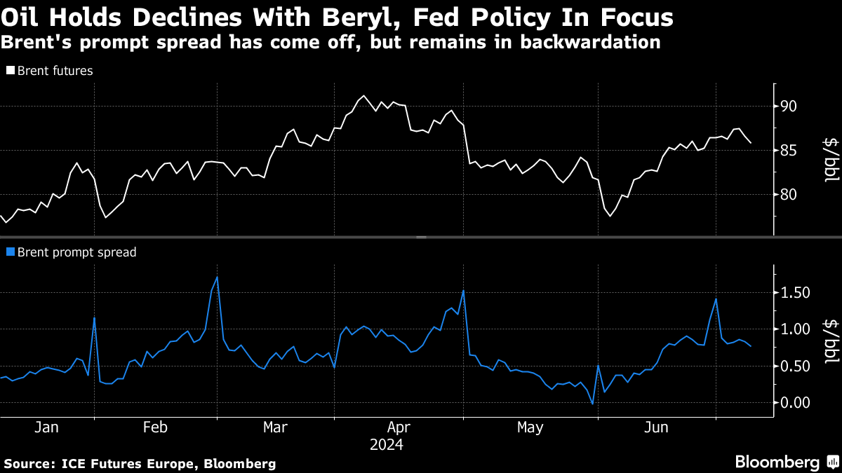 Beryl’s impact on supply “has been more limited than what was initially expected,” which has helped prices unwind, said Yeap Jun Rong, market strategist at IG Asia Pte in Singapore. Investors are also likely to remain cautious in the lead-up to the Fed chair’s testimony, as well as key US inflation data this week, he said.