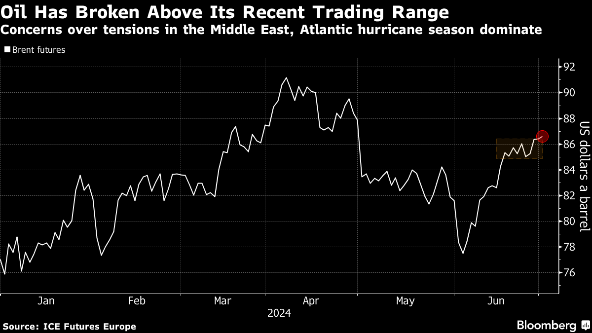 (Bloomberg) -- Oil traded near a two-month high after breaking out of its recent trading range on an escalation in tensions in the Middle East and concerns over the rapid start to the Atlantic hurricane season.