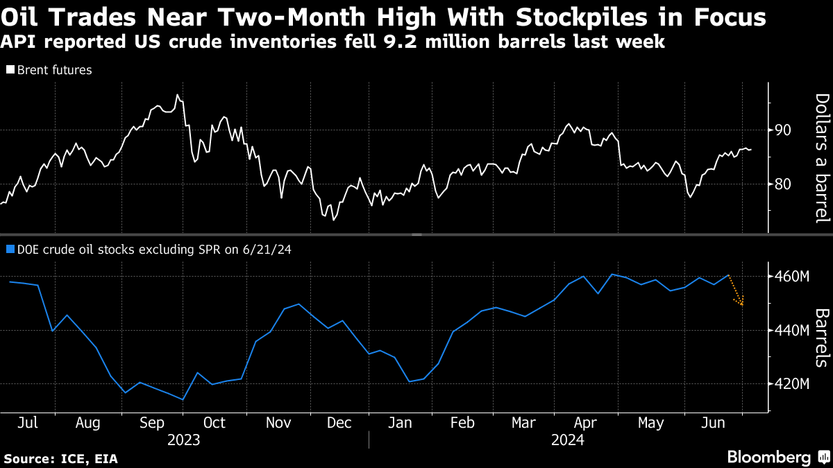 Brent crude traded above $86 a barrel after slipping 0.4% on Tuesday, with West Texas Intermediate near $83. The American Petroleum Institute reported crude inventories shrank 9.2 million barrels last week, according to people familiar with the data. If confirmed in official figures later Wednesday, that would be the largest drop in barrel terms since January.