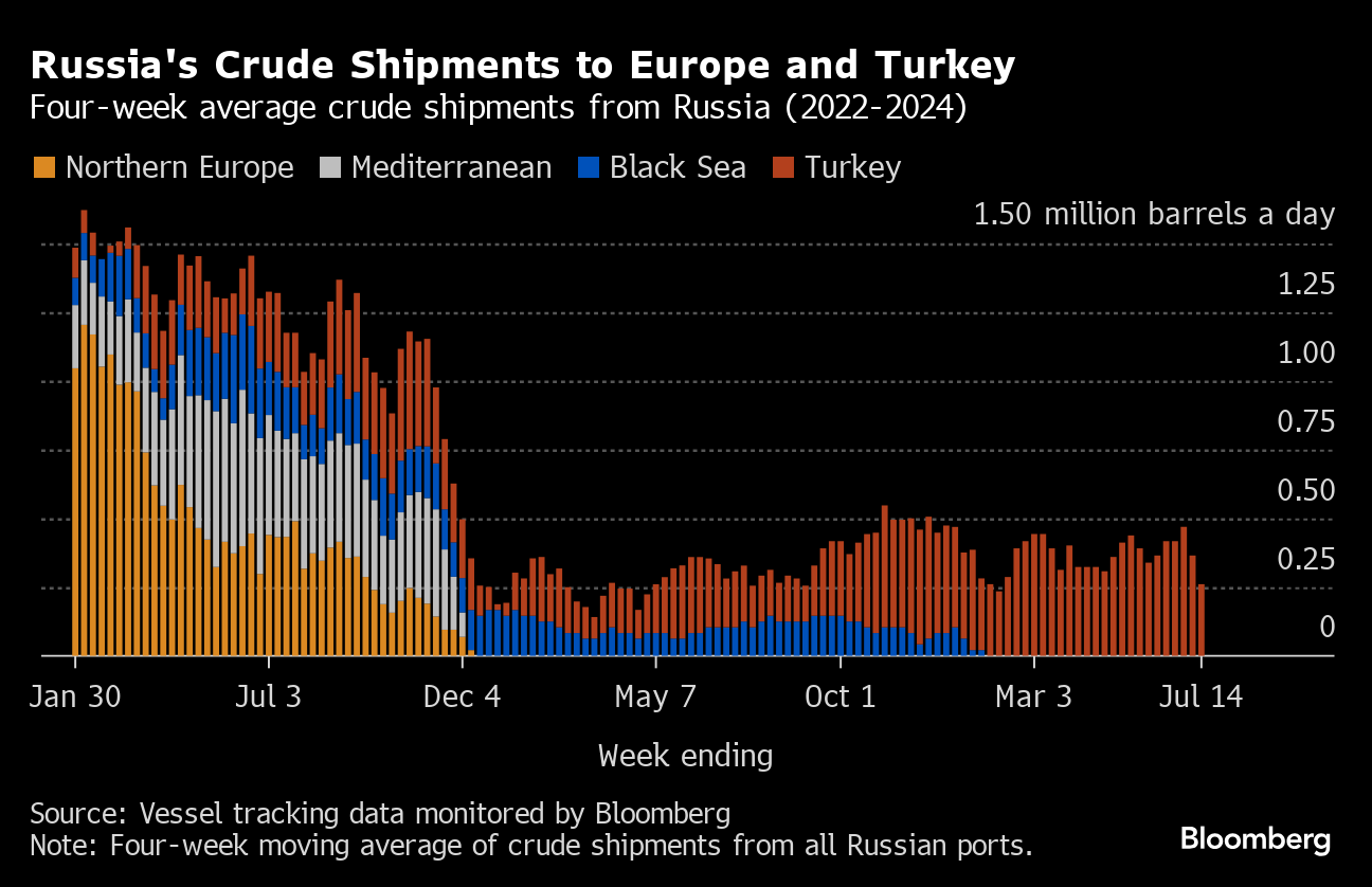 Turkey is now the only short-haul market for shipments from Russia’s western ports, with flows in the 28 days to July 14 falling to about 260,000 barrels a day, their lowest since February.