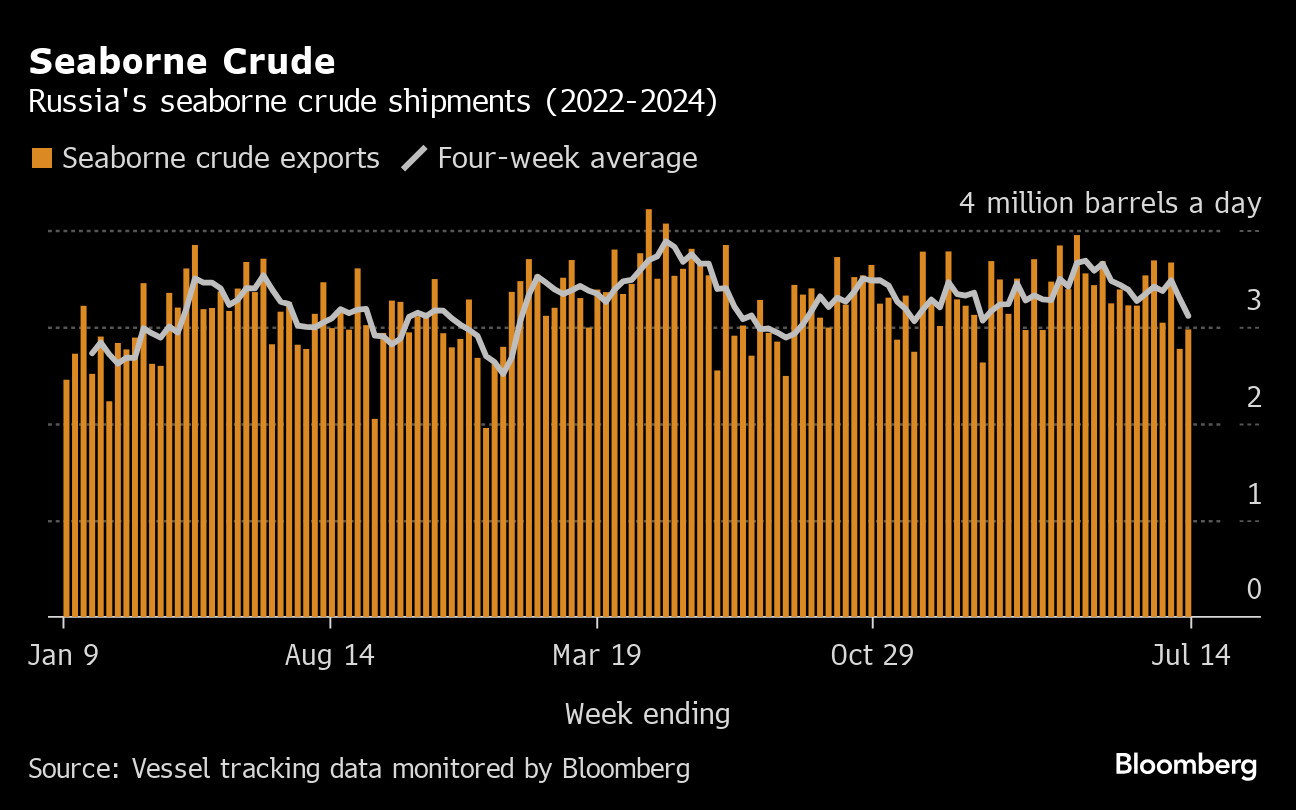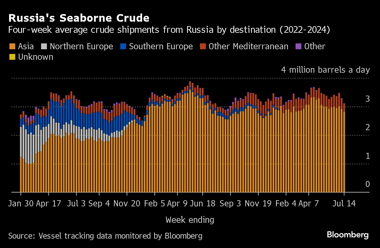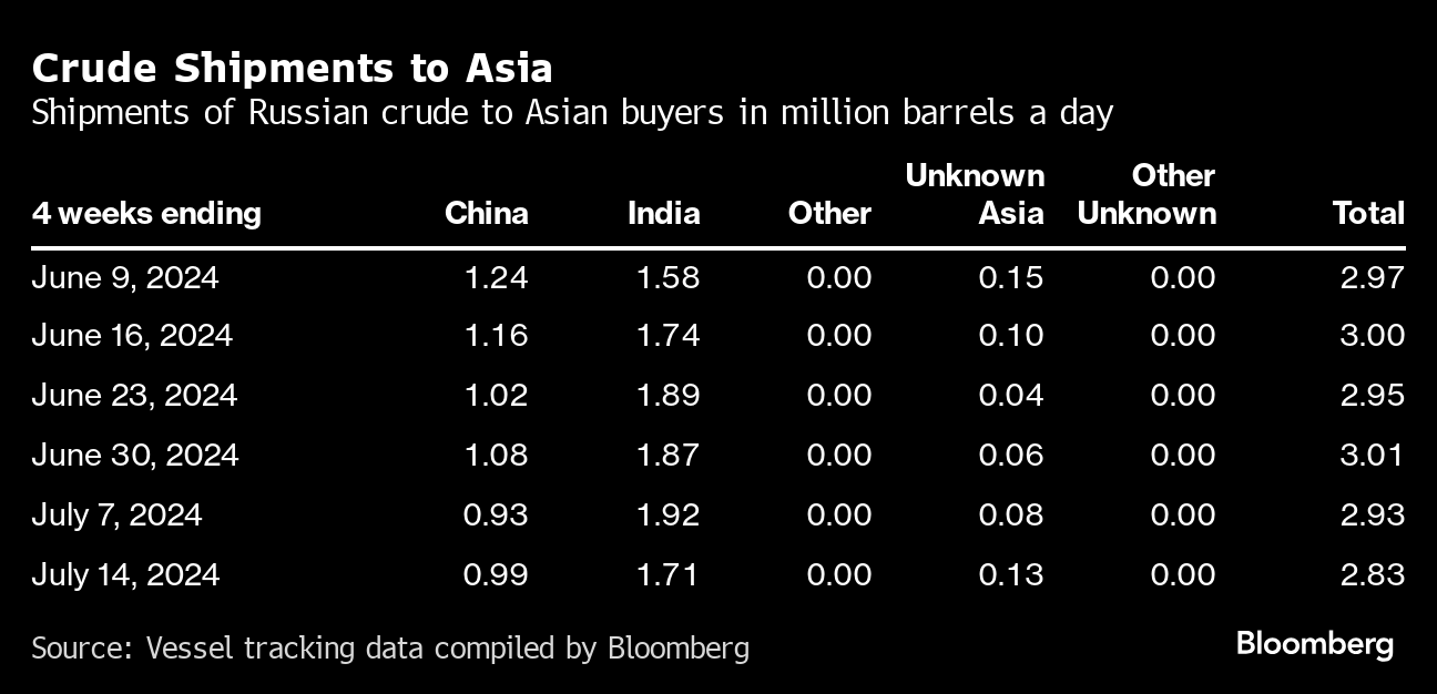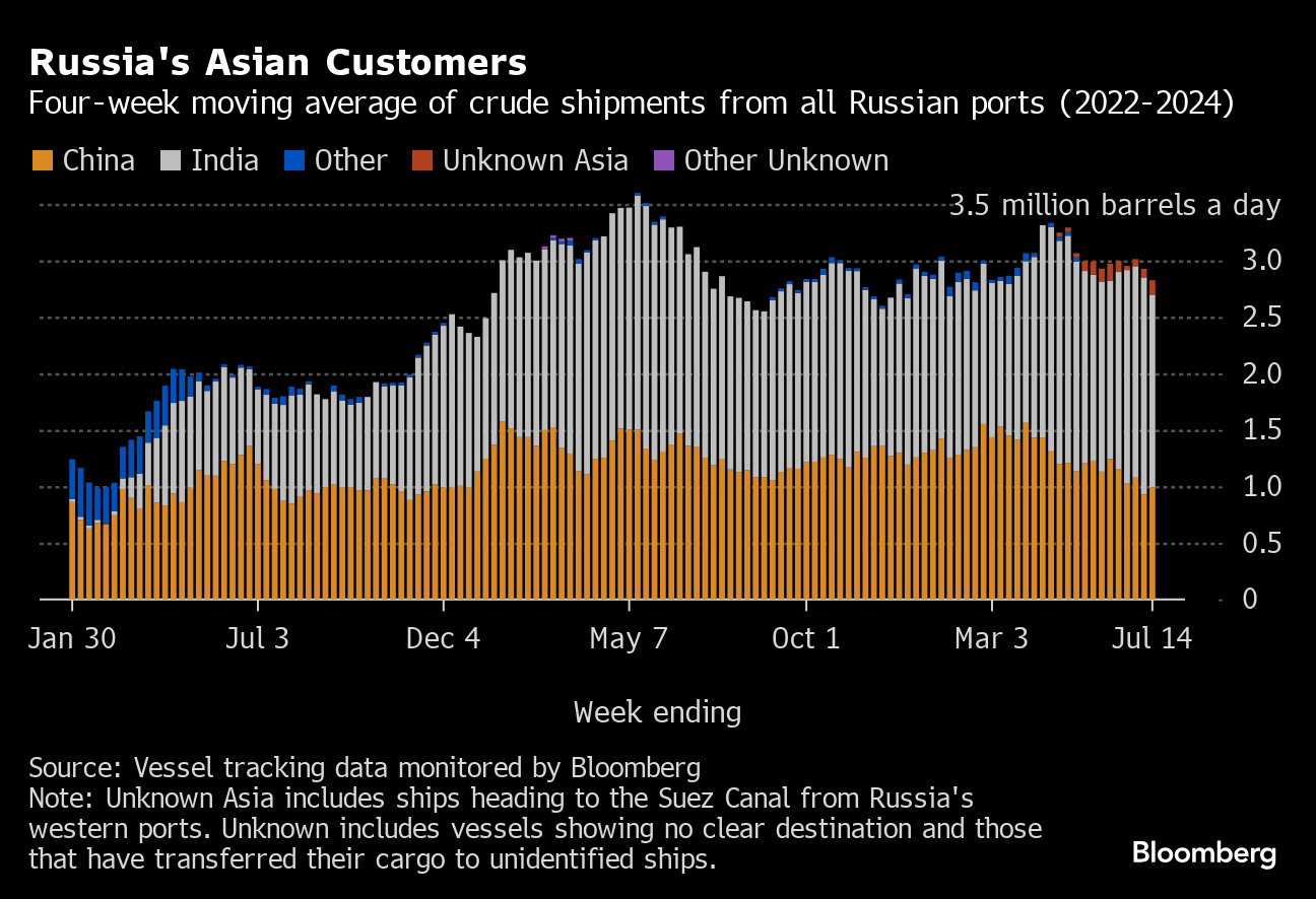 Observed shipments to Russia’s Asian customers, including those showing no final destination, fell to a five-month low of 2.83 million barrels a day in the four weeks to July 14.