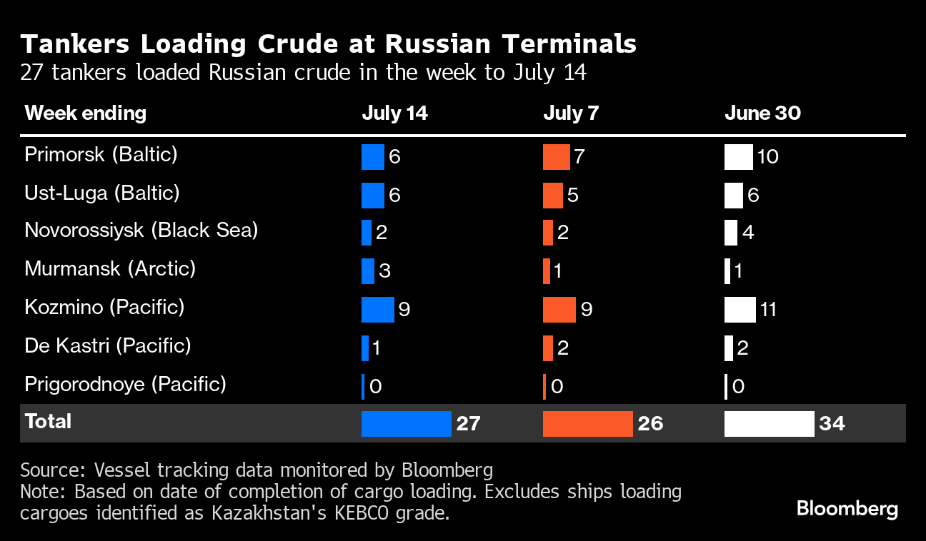 A total of 27 tankers loaded 20.8 million barrels of Russian crude in the week to July 14, vessel-tracking data and port agent reports show. That was up slightly from a revised 19.4 million barrels on 26 ships the previous week.
