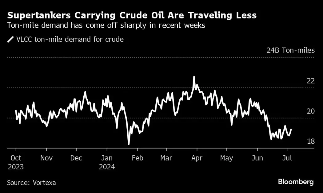The softness comes as demand for VLCCs has fallen in recent weeks, with an industry gauge known as ton-miles dropping sharply, according to data analytics firm Vortexa Ltd. The measure multiplies cargo by how far it is transported, giving a sense of how heavily used the global shipping fleet is.