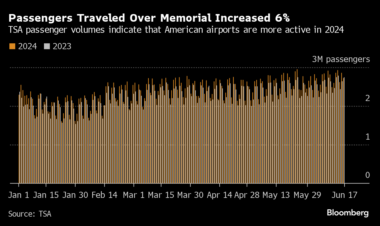 Rebounding air travel, in particular, has been a bright spot for fuel demand, with one measure of jet fuel consumption sitting at the highest since 2019. During the Memorial Day holiday long weekend in May, about 6% more passengers flew compared with 2023, according to JPMorgan Chase & Co. analysts, who cited Transportation Security Administration data.