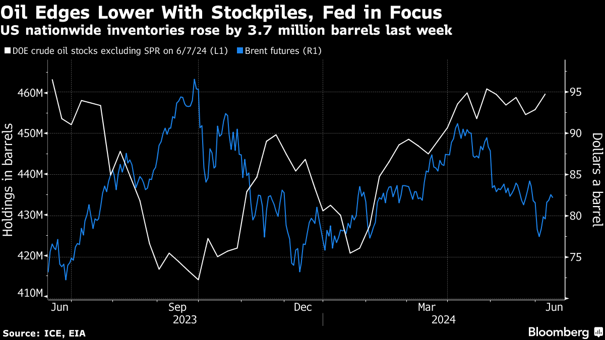 Brent dipped toward $82 a barrel after climbing almost 4% this week, while West Texas Intermediate traded near $78. US crude inventories swelled by 3.7 million barrels last week, compared with an industry report that had pointed to a draw. Government figures also signaled rising gasoline stockpiles.