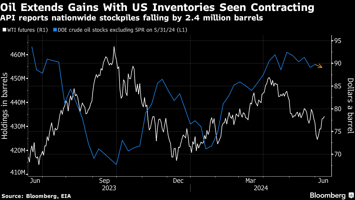 Brent futures climbed above $82 a barrel after rising almost 3% at the start of the week, while West Texas Intermediate traded near $78. The American Petroleum Institute reported that US crude inventories dropped by 2.4 million barrels last week, according to people familiar with the data.