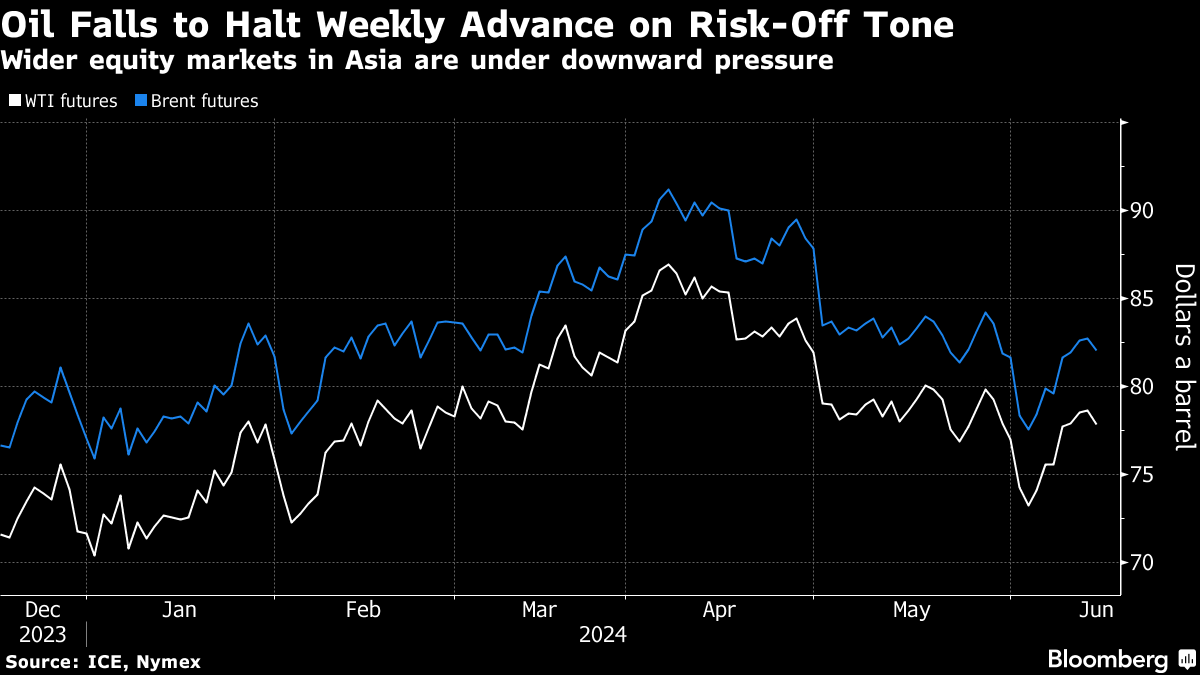 Brent dropped toward $82 a barrel, on track to snap four days of gains, while West Texas Intermediate was near $78. Stocks in the region fell, putting downward pressure on risk assets such as oil. While there have been signs of cooling US inflation, Federal Reserve officials this week penciled in only one interest-rate cut this year.