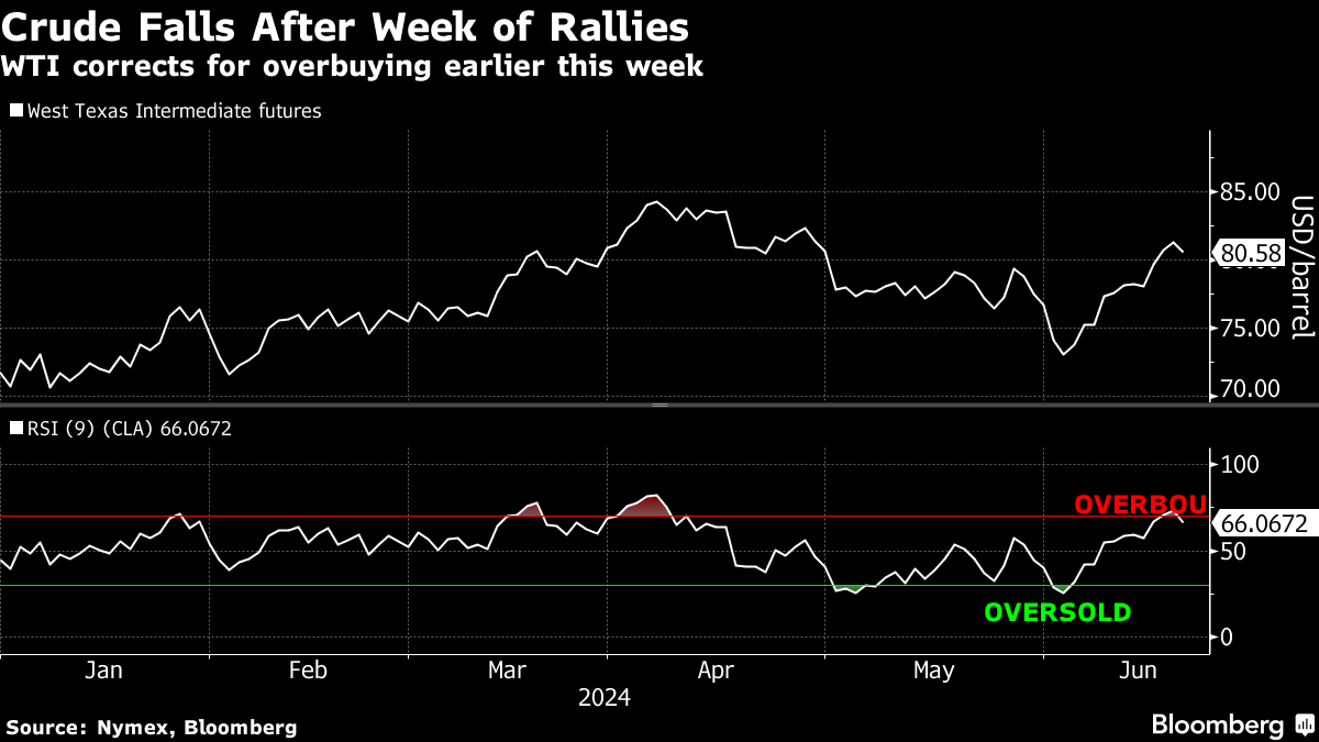 (Bloomberg) -- Oil fell after futures crossed into overbought territory, though crude still notched a weekly gain amid shrinking US stockpiles and signs of rising fuel demand.