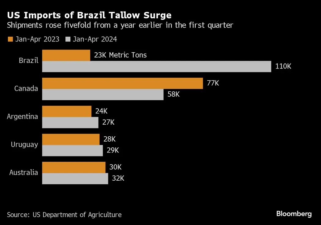 Total US tallow imports rose fourfold since 2019 to a record 779,300 metric tons in 2023, according to US government trade data. Brazil, which made up for roughly 23% of shipments last year, saw its share jump to 40% in the first four months of the year.