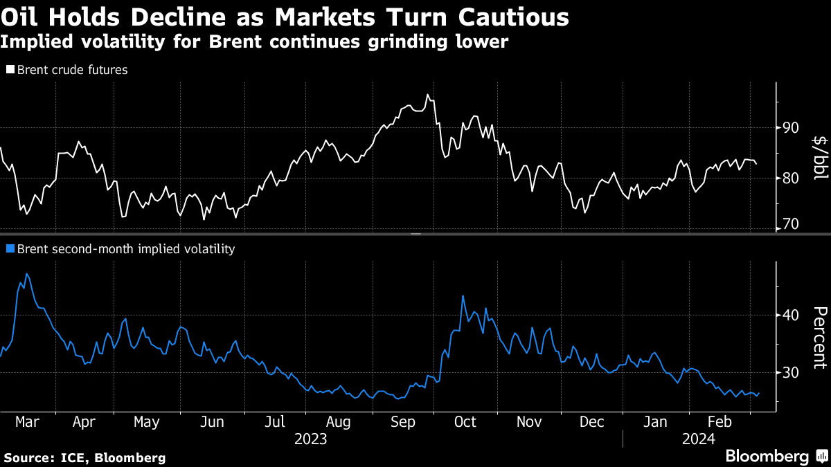 Crude has been on a slow-motion ascent that has seen Brent gain around 7% this year, bolstered by tensions in the Middle East and OPEC+’s limiting of supply. That optimism has been tempered by strong production from outside of the cartel, a shaky demand outlook in China and the paring back of expectations for when central banks will start monetary easing.