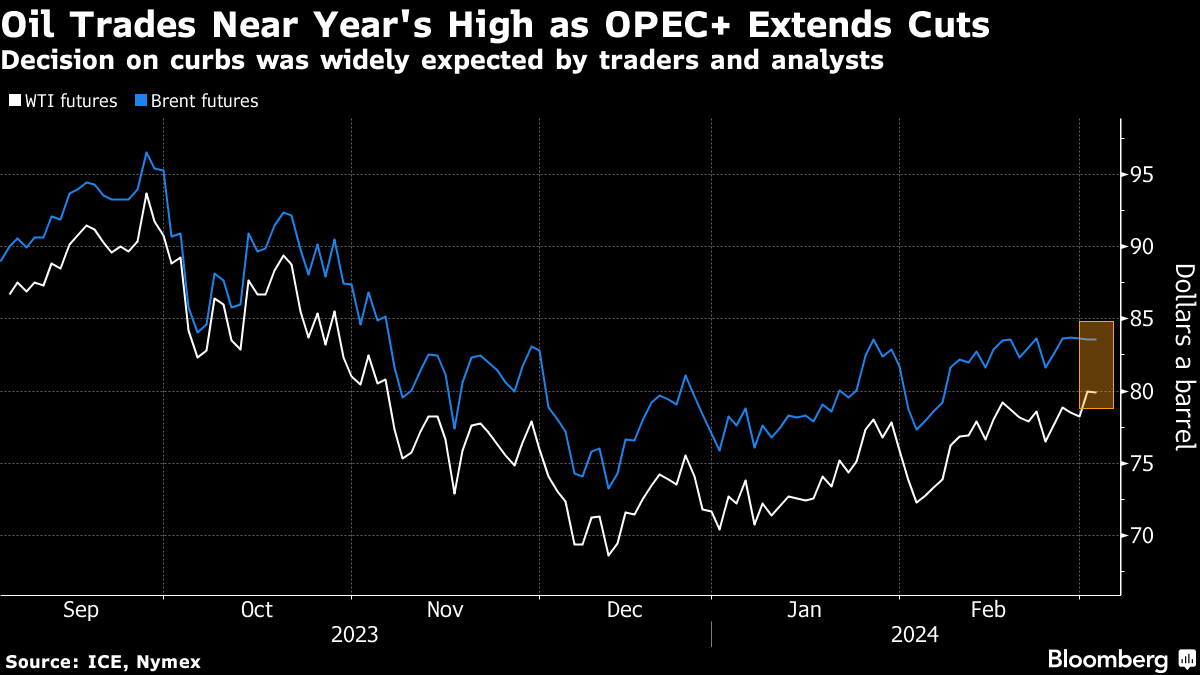 Brent futures traded near $84 a barrel after rising 2% in the previous session. US benchmark West Texas Intermediate was close to $80, having breached the psychological level on Friday for the first time since November. The Organization of the Petroleum Exporting Countries and its allies extended their 2 million-barrel-a-day reduction through the end of June.