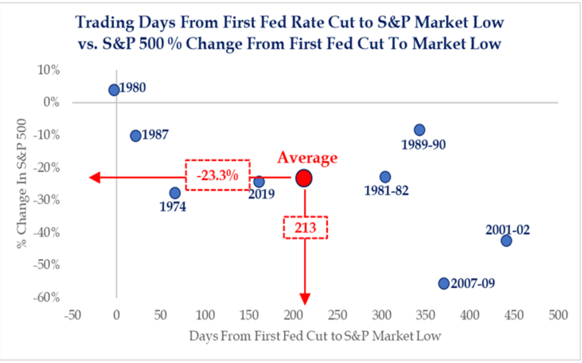 On average, the S&P 500 is up more than 5% over 100 days between the last Fed tightening and the first rate cut, he noted. However, the trough in the broader market exceeds a 23% drop over 200 days after the first rate cut in a series.