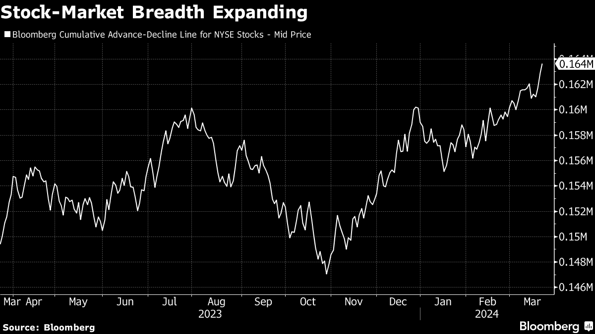 Still, overall market breadth continues to expand, he added, citing the fact that the cumulative advance-decline line for New York Stock Exchange shares is now close to breaking new all-time highs.