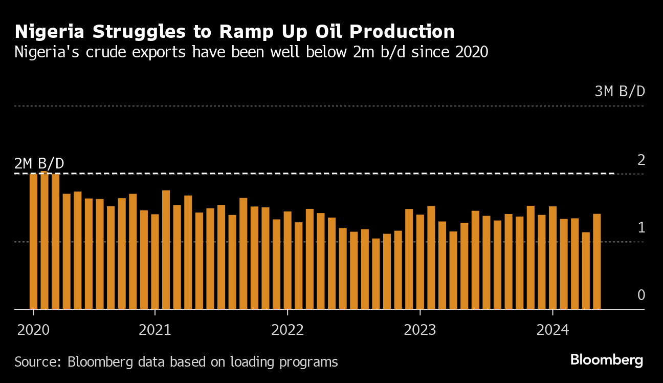 The nation pumped about 1.45 million barrels a day of crude and liquids in April, still far below its estimated production capacity of 2.6 million barrels a day. Crude theft, aging oil pipelines, low investment, and divestments from oil majors operating in the West African nation have all contributed to declining production.