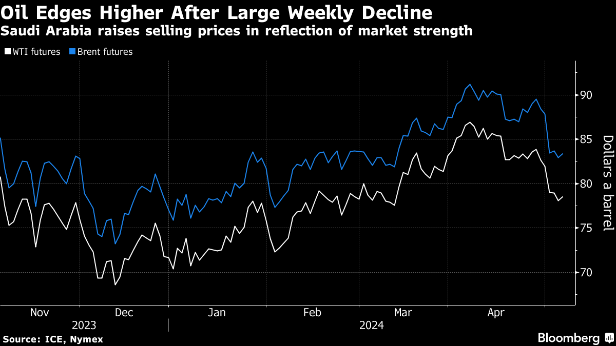 Brent climbed above $83 a barrel after slumping more than 7% last week to post the biggest loss since February. West Texas Intermediate was around $78. Saudi Aramco raised the June official selling price of its flagship Arab Light grade by 90 cents to $2.90 a barrel above benchmark prices. That compares with an increase of 60 cents forecast in a Bloomberg survey.