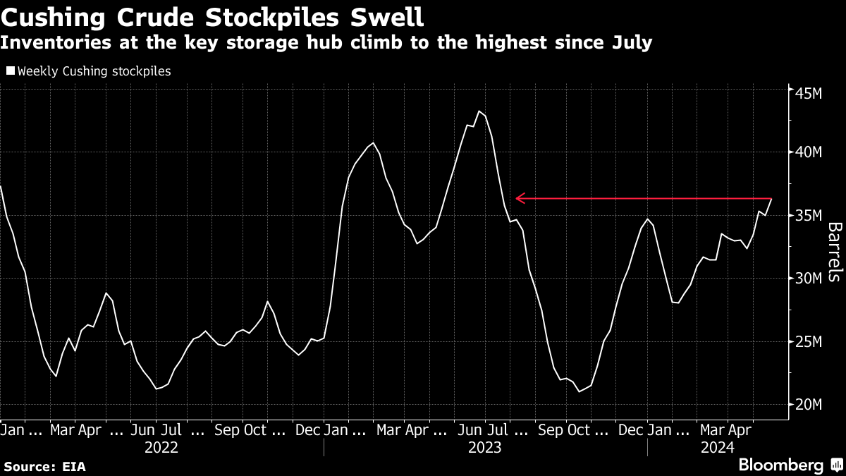 Oil is still higher this year in part due to supply cuts from the producer group, although prices have eased since mid-April. US crude stockpiles rose last week, while inventories at the storage hub at Cushing, Oklahoma, swelled to the highest level since July, according to government data.