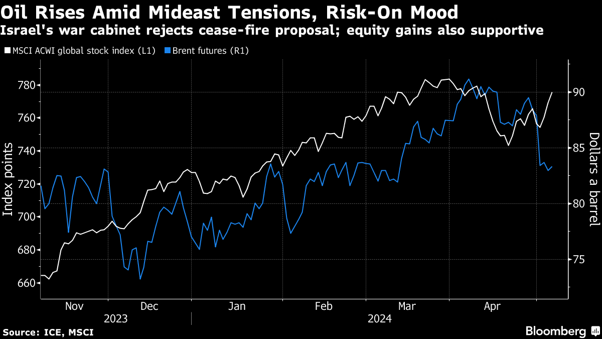 Global benchmark Brent pared an earlier advance but was still pushing toward $84 a barrel, after closing 0.5% higher on Monday. West Texas Intermediate was near $79. Israel’s war cabinet unanimously rejected a cease-fire proposal agreed to by Hamas. The Jewish state has vowed to continue military operations in Rafah, a major Gazan city.