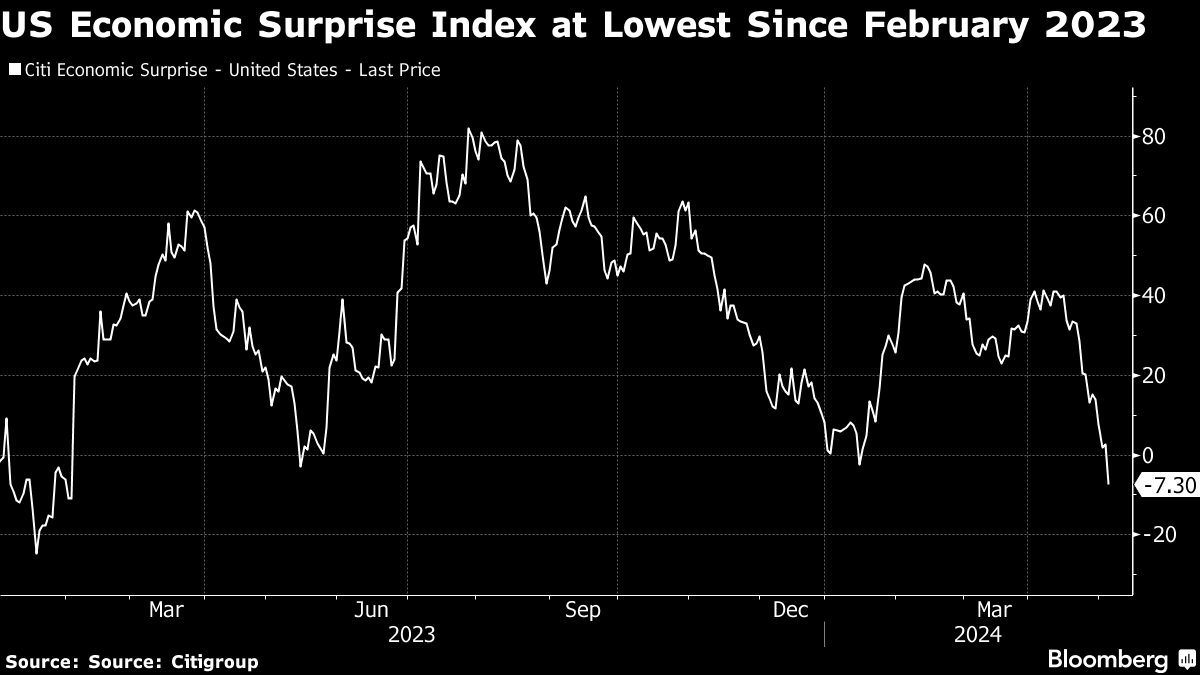 Amid a slowdown in key areas like jobs, services and manufacturing, the US version of Citigroup’s Economic Surprise Index — which measures the difference between actual releases and analyst expectations — hit the lowest since February 2023. Nonfarm payrolls rose 175,000 last month, the smallest gain in six months. Unemployment ticked up to 3.9% and wage gains cooled.