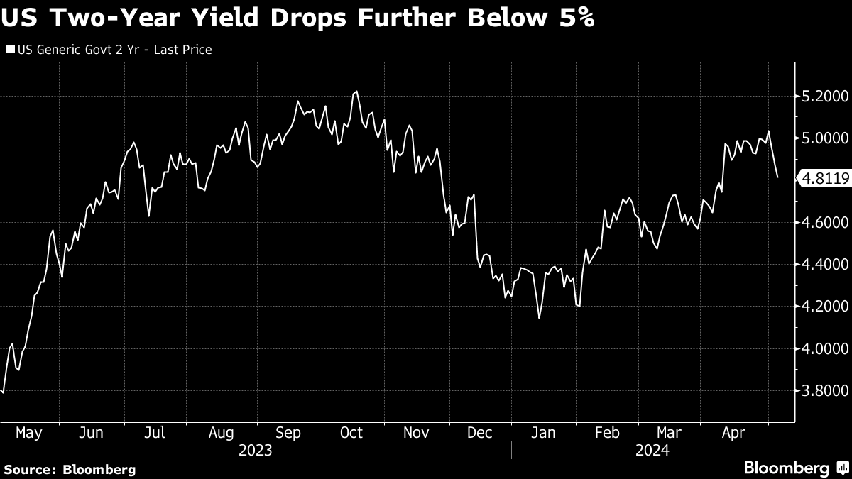 Equities headed toward their biggest gain since February, with the market also buoyed by Apple Inc.’s post-earnings surge. Treasury two-year yields, which are more sensitive to imminent Fed moves, tumbled as many as 17 basis points before paring the move. The dollar extended its slide into a third day.