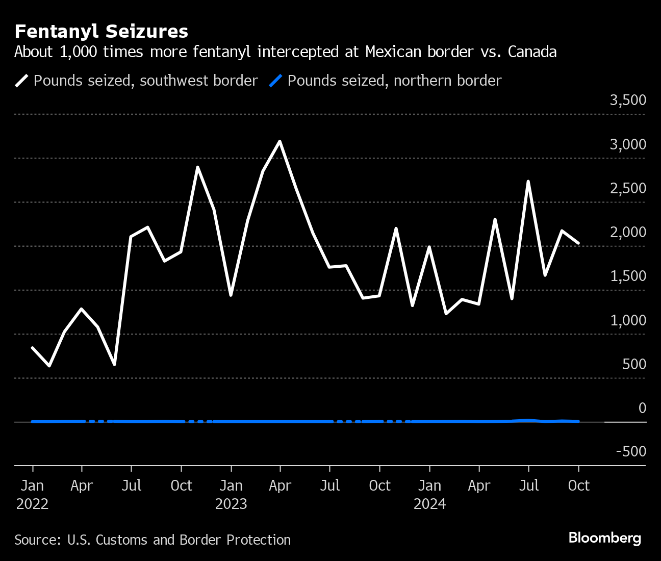 The volume of fentanyl seized at the Mexican border since the beginning of 2022 is about 1,000 times greater than what has been captured at the Canadian border, according to US Customs and Border Protection data.