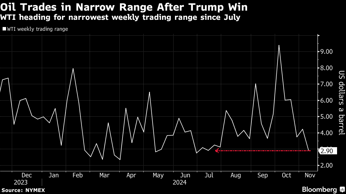 West Texas Intermediate has traded in a roughly $3 range this week, with investors in wait-and-see mode following Donald Trump’s election victory. Uncertainty about how the president-elect will handle the Middle East conflict and Iranian oil exports has fueled high volatility while tamping down liquidity. Still, renewed concerns about demand in China, the world’s largest oil consumer, sent crude 2.5% lower to trade near $70 a barrel Friday.