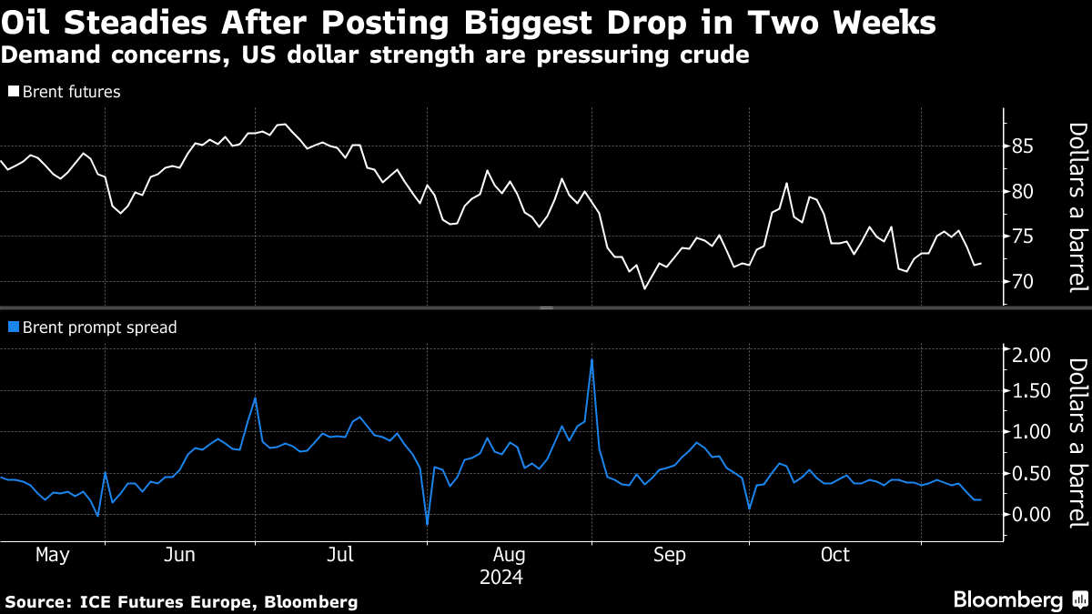 Brent crude traded below $72 after dropping nearly 3% Monday, with West Texas Intermediate around $68. China’s latest measures to kick-start its economy stopped short of direct stimulus, and inflation remains weak. A gauge of the dollar has hit a one-year high as investors adjust to Donald Trump’s victory, making oil more expensive for most buyers.